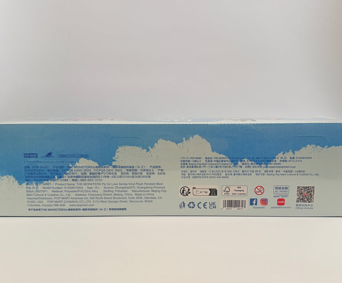 Discover the charm of THE MONSTERS’ Pin for Love Series! Each blind box contains one surprise vinyl plush pendant (letters N–Z), perfect for collecting, gifting, or accessorizing your bag, keys, or display shelf. With its soft plush texture and cute, detailed design, this series adds a playful touch to any collection. Sealed blind box – your character is a mystery until you open it!